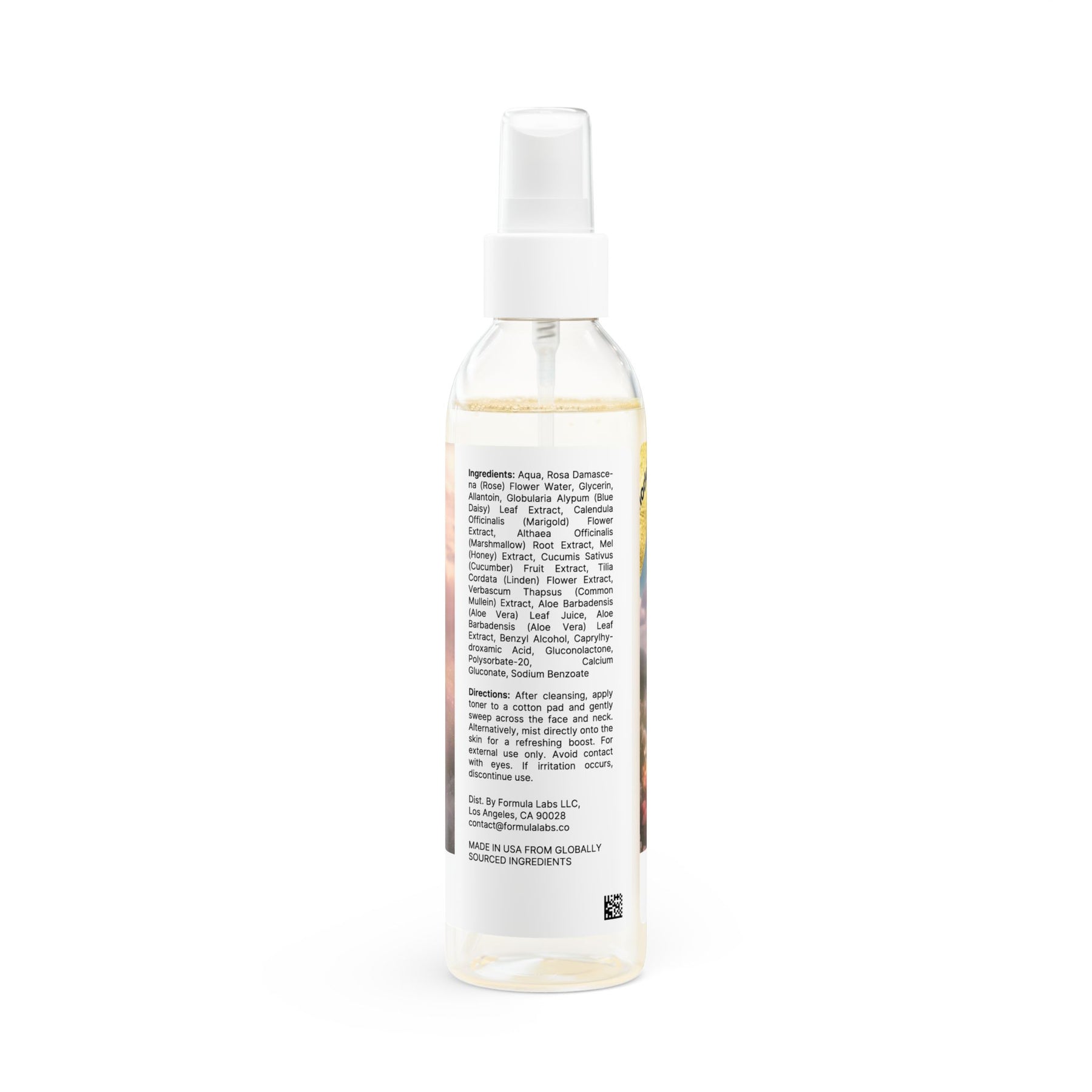 Ingredients: Aqua, Rosa Damascena (Rose) Flower Water, Glycerin, Allantoin, Globularia Alypum (Blue Daisy) Leaf Extract, Calendula Officinalis (Marigold) Flower Extract, Althaea Officinalis (Marshmallow) Root Extract, Mel (Honey) Extract, Cucumis Sativus (Cucumber) Fruit Extract, Tilia Cordata (Linden) Flower Extract, Verbascum Thapsus (Common Mullein) Extract, Aloe Barbadensis (Aloe Vera) Leaf Juice, Aloe Barbadensis (Aloe Vera) Leaf Extract, Benzyl Alcohol, Caprylhydroxamic Acid, Gluconolactone, Polysorbate-20, Calcium Gluconate, Sodium Benzoate.